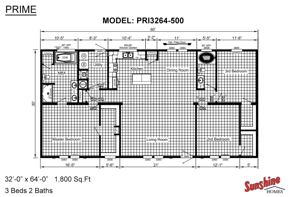 Special OrderThe Prime PRI3264-500 is a spacious manufactured home designed to accommodate larger families. It features three bedrooms and two bathrooms, spread over a generous 1800 square feet of living space. The dimensions of the home are 32’0″ x 64’0″. Inside, the home boasts real wood cabinets with soft close drawers and doors, Solido Edge countertops with continuous backsplashes, and fiberglass bathtubs in the bathrooms. The kitchen is equipped with 42" wood cabinets, a stainless steel smooth top range, and a double bowl stainless steel farm sink.